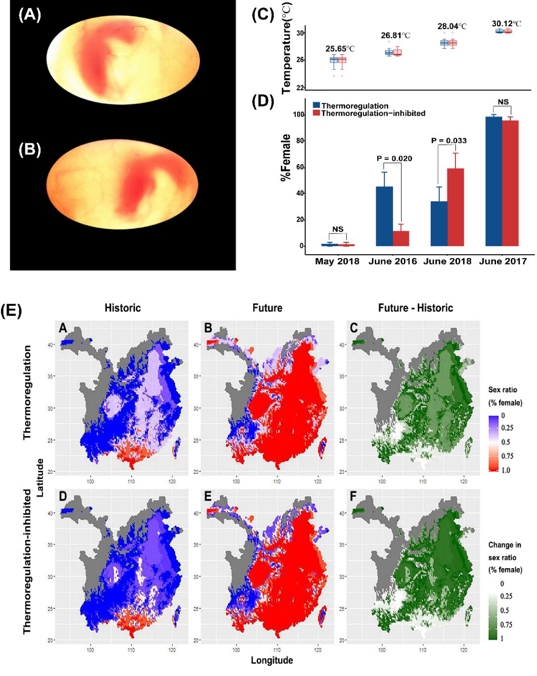 1.乌龟胚胎通过行为热调节影响自身性别:发现乌龟胚胎通过热调节行为选择适宜发育温度影响自身性别,预测胚胎行为热调节能缓冲气候变化导致种群性比偏移的负面影响。该研究首次揭示了龟鳖动物胚胎行为热调节的重要适应意义,为认识龟类如何应对气候变化提供全新的视角(Ye et al, 2019, Current Biology)。
