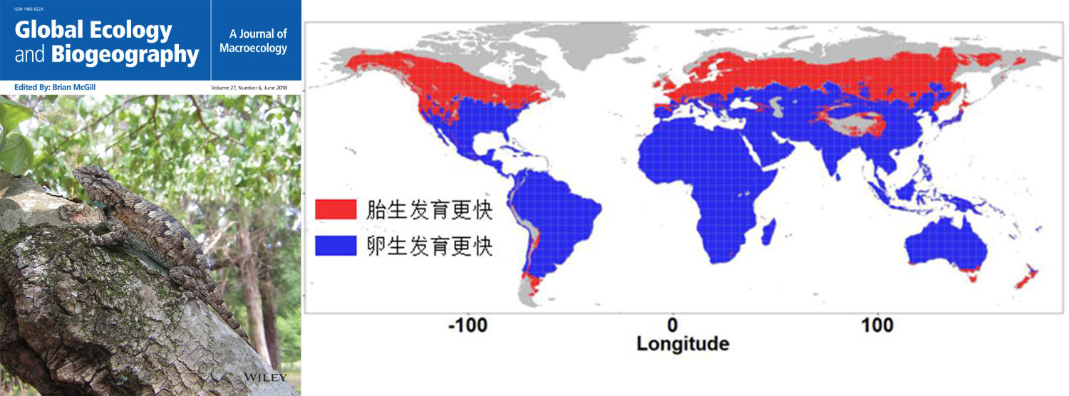 应用生态机制模型揭示胎生物种的胚胎发育在寒冷区域比卵生物种快,但在温暖区域比卵生物种慢。胚胎发育时间的相对优势与两种繁殖模式物种的地理分布格局吻合,验证了有鳞类胎生进化的冷气候假说,揭示了卵生和胎生物种适应不同气候的生理机制(Ma et al, 2019, Global Ecology and Biogeography)。