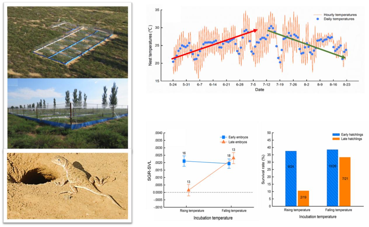 我们利用无线电追踪技术研究荒漠蜥蜴的巢址选择,发现母体选择温暖潮湿的巢址环境以提升后代的适合度。此外,野外巢址温度环境存在季节变异,繁殖季节胚胎于季节匹配的温度环境下发育,具有更好的适合度,据此我们提出了“胚胎发育季节匹配”假说 (Li et al,. 2018, Functional Ecology; Sun et al., 2018, Functional Ecology)。
